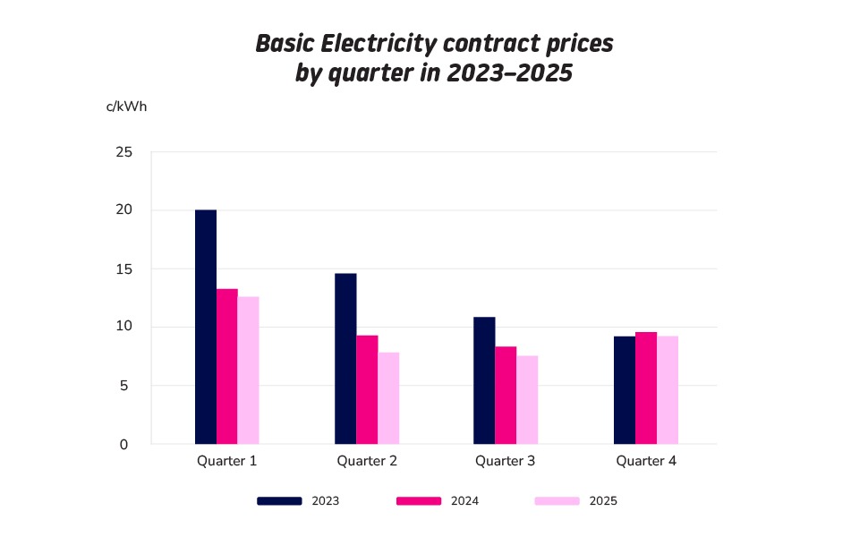 The price is updated quarterly, i.e. four times a year, and responds more slowly to the market than spot electricity. Usually, summer months are slightly cheaper, while prices rise somewhat in winter.