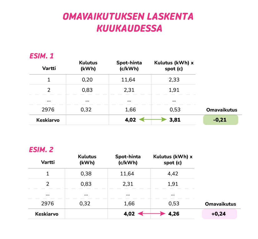 - Jos käytät sähköä eniten niinä vartteina, kun sähkö on kuukauden spot-keskihintaa halvempaa, laskee omavaikutuksesi ja saat säästöä laskuun.