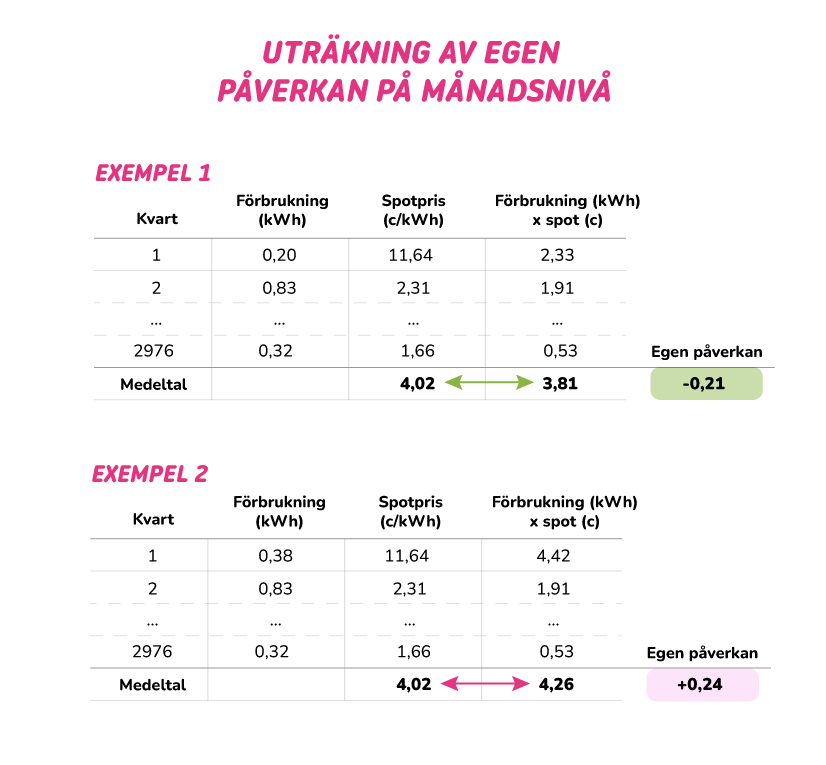 Du kan i vår app följa hur din egen påverkan varierar under månadens gång. Den slutgiltiga effekten av egen påverkan beräknas först i början av följande månad, när uppgifter om hur mycket du förbrukat och när samt elbörsens medelpris finns till hands.